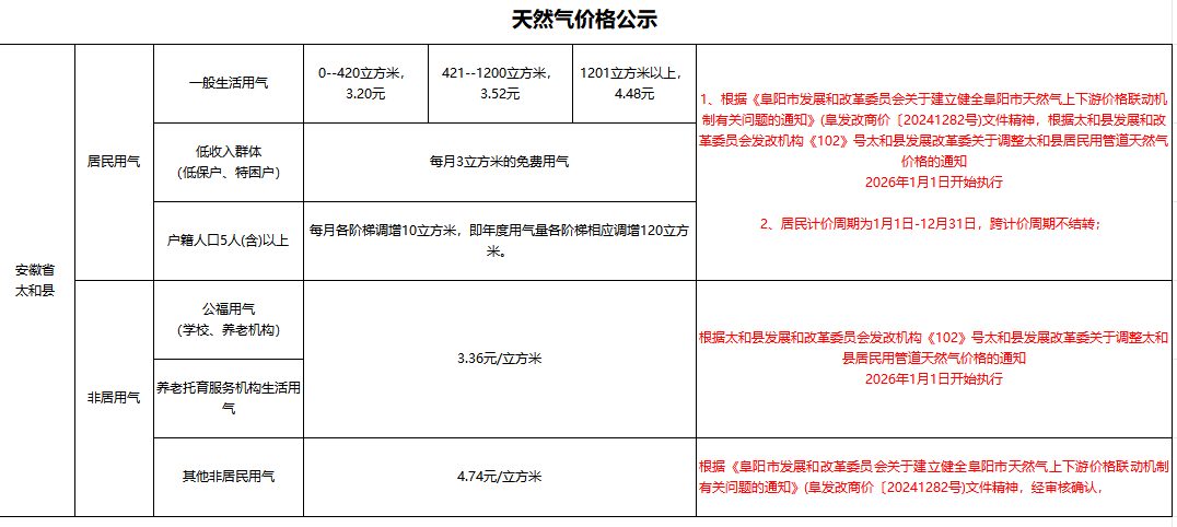 关于临泉县2025年7-9月份非居民用管道天然气销售价格情况的通告