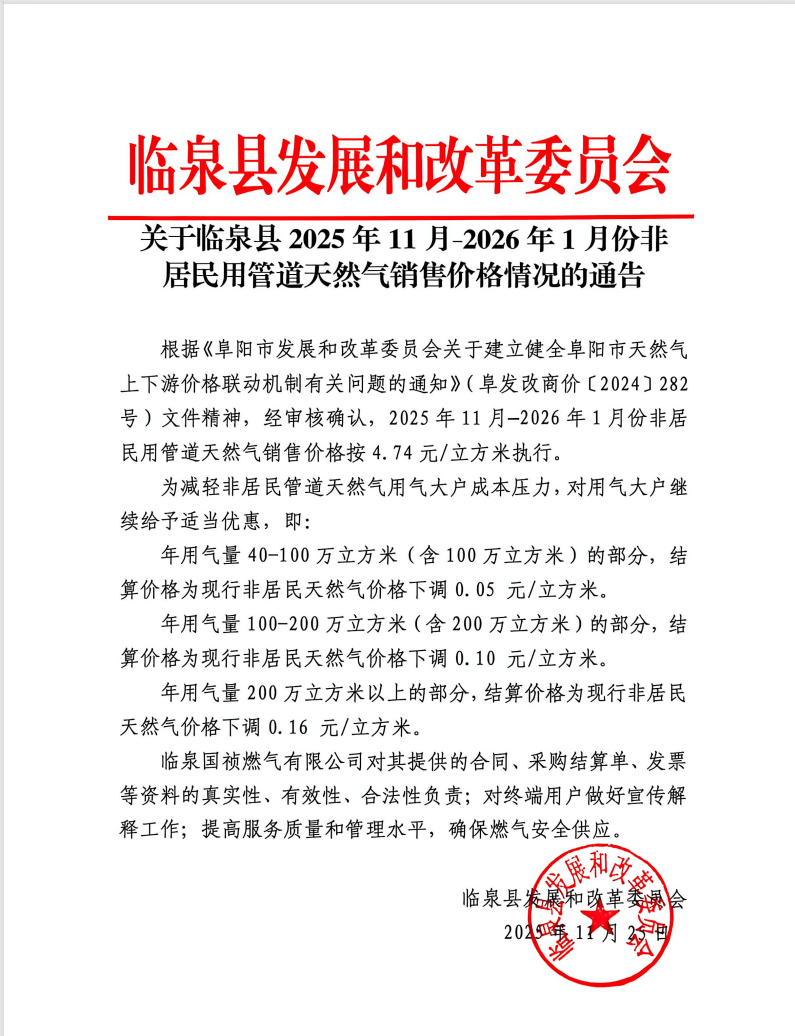 关于临泉县2025年11月-2026年1月份非居民用管道天然气销售价格情况的通告