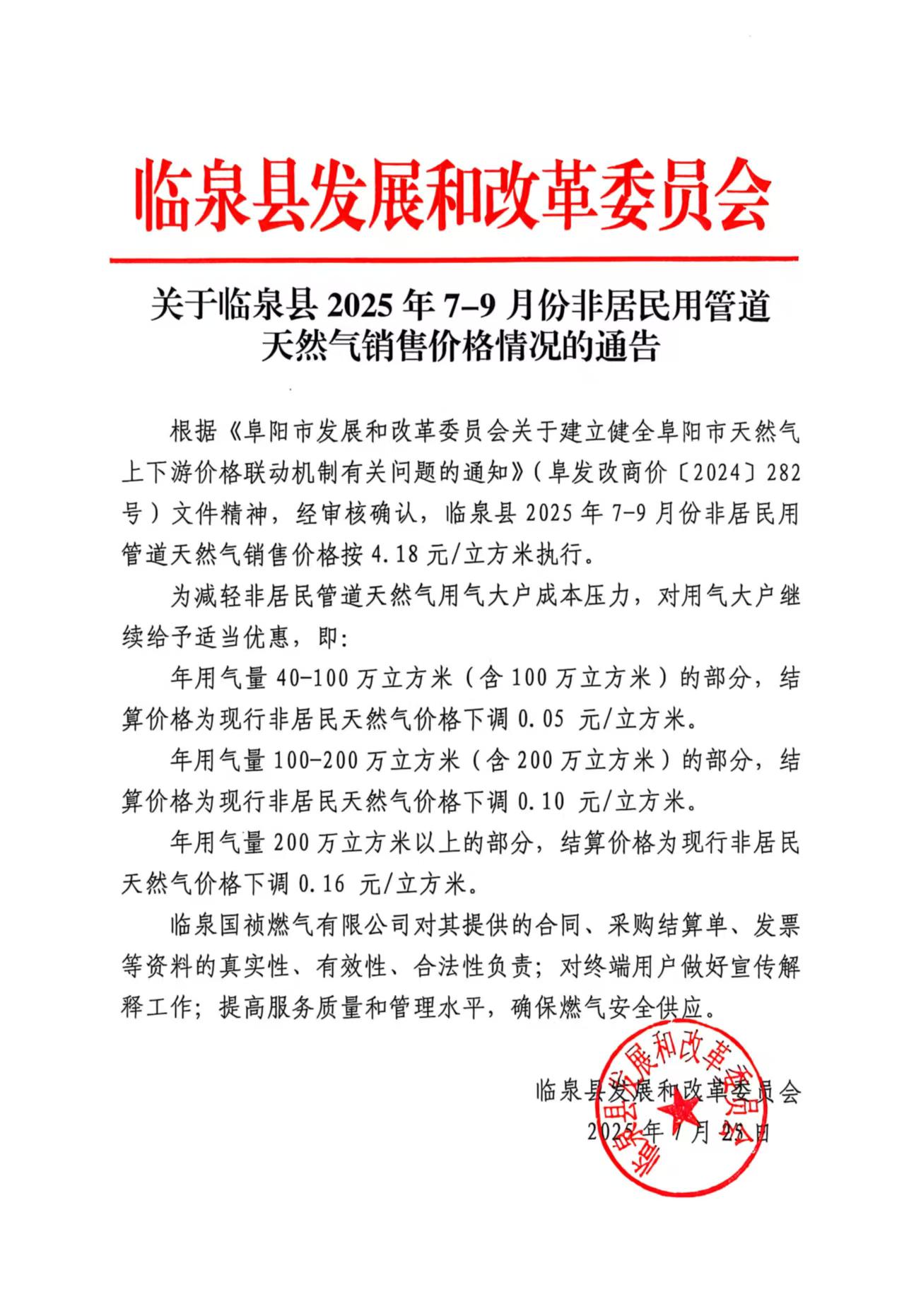 关于临泉县 2025年10月份非居民用管道天然气销售价格情况的通告