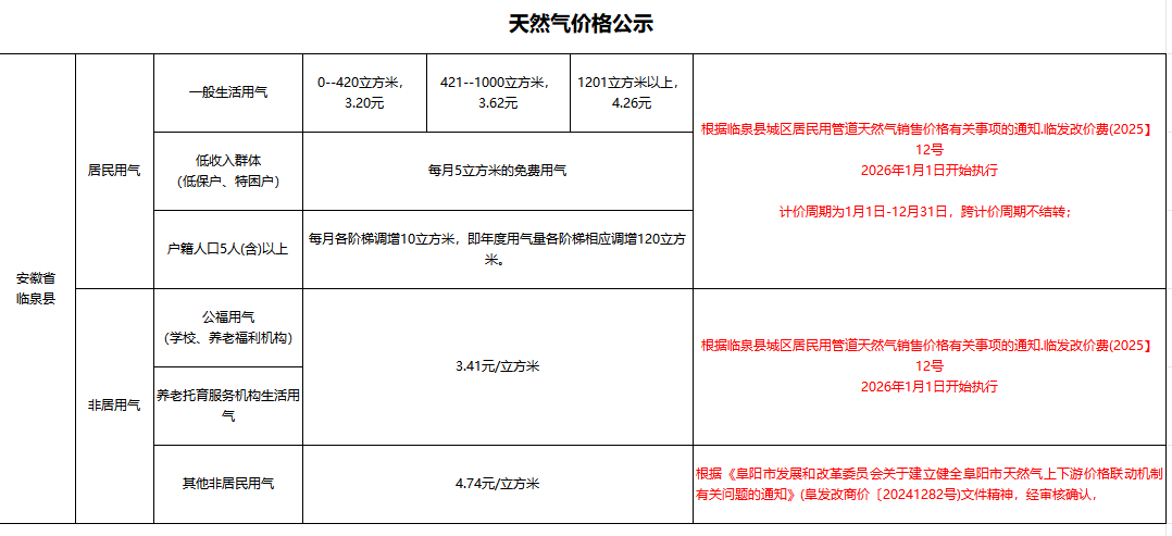 关于临泉县 2025年10月份非居民用管道天然气销售价格情况的通告
