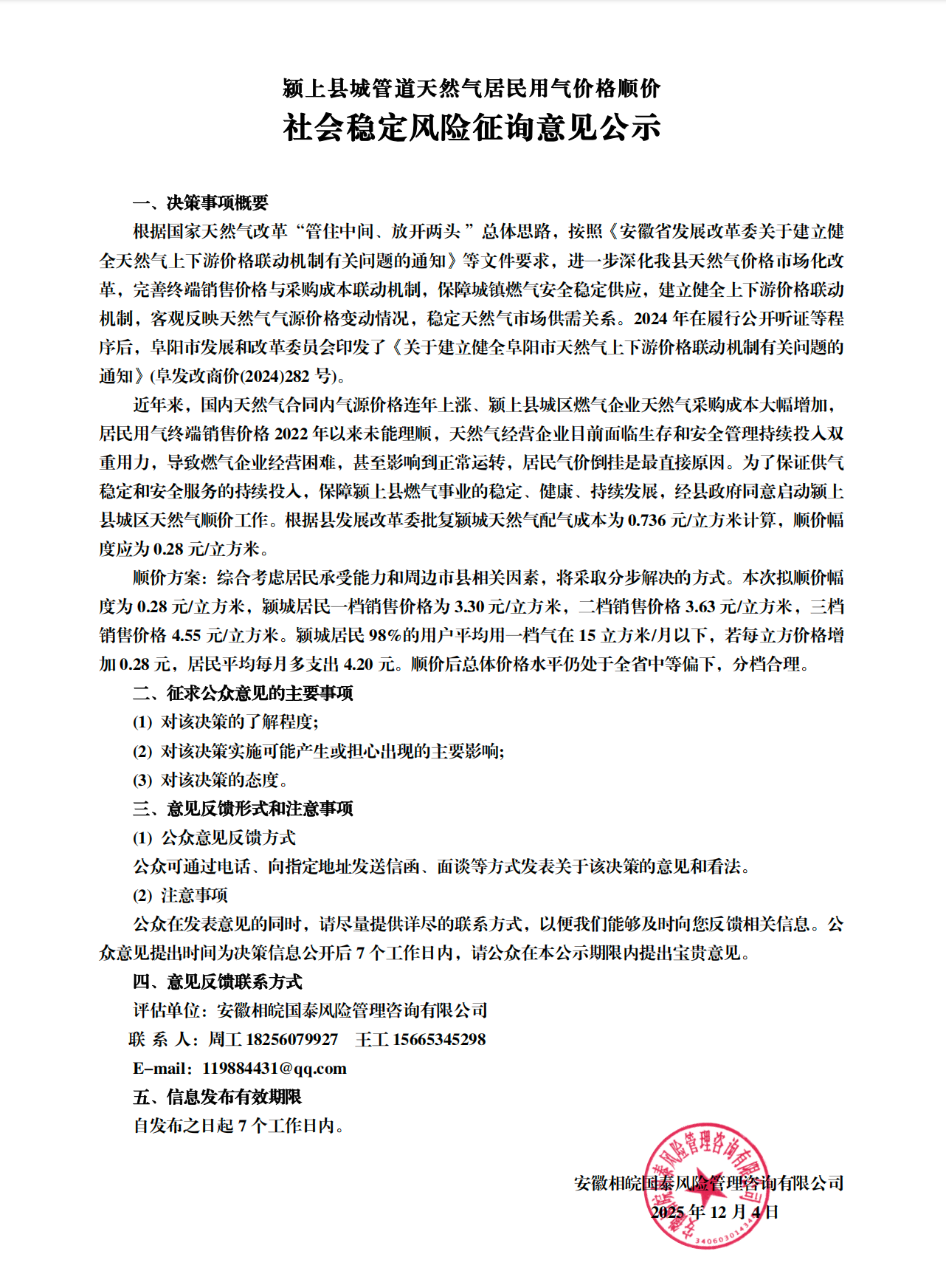 颍上县城管道天然气居民用气价格顺价社会稳定风险征询意见公示