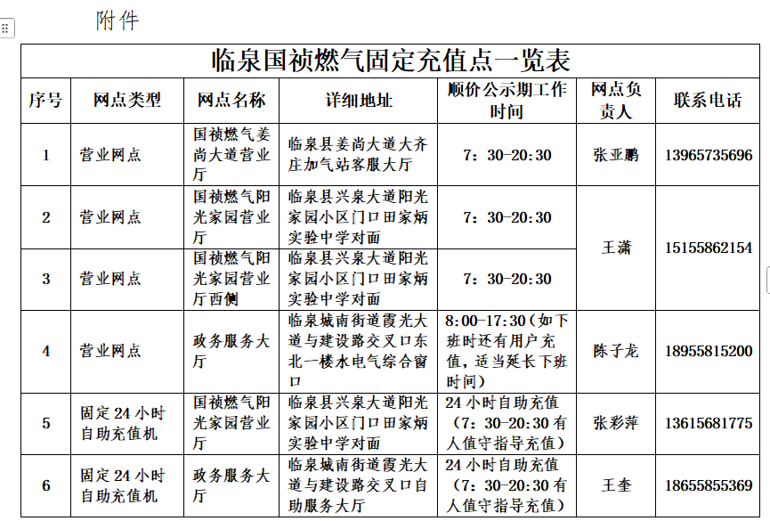 6.具体充值网点。详见附件《临泉国祯燃气固定充值点一览表》