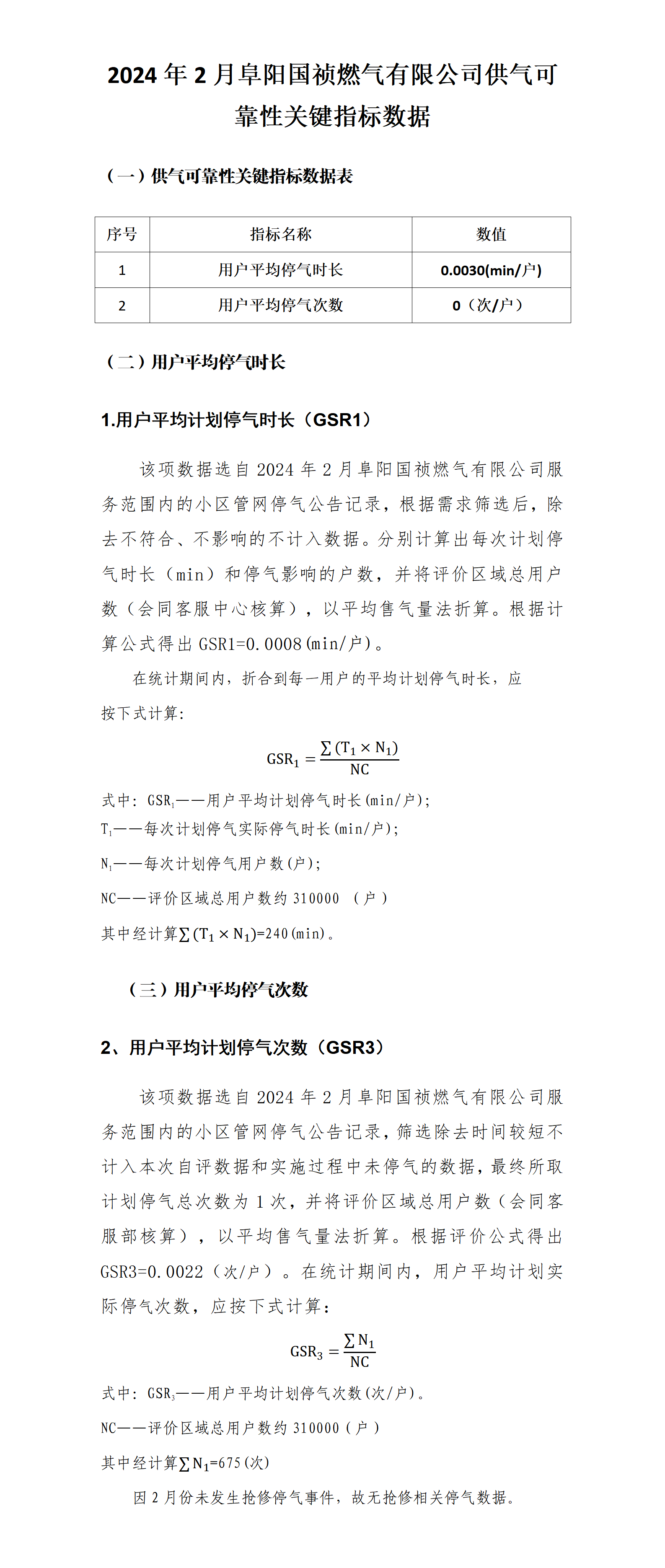 2024年2月阜阳国祯燃气有限公司供气可靠性关键指标数据