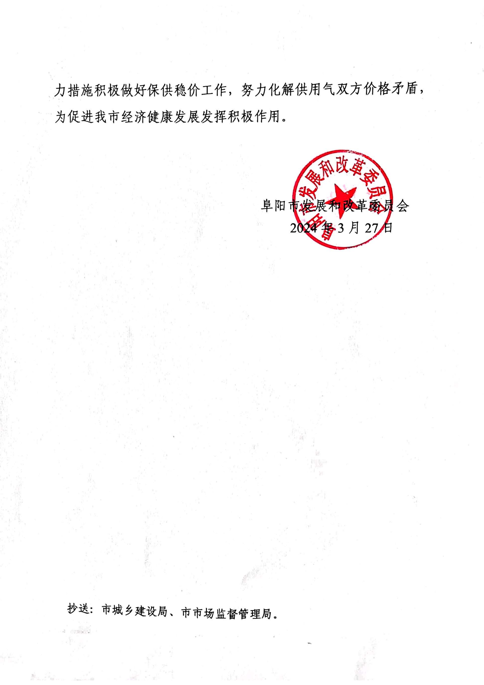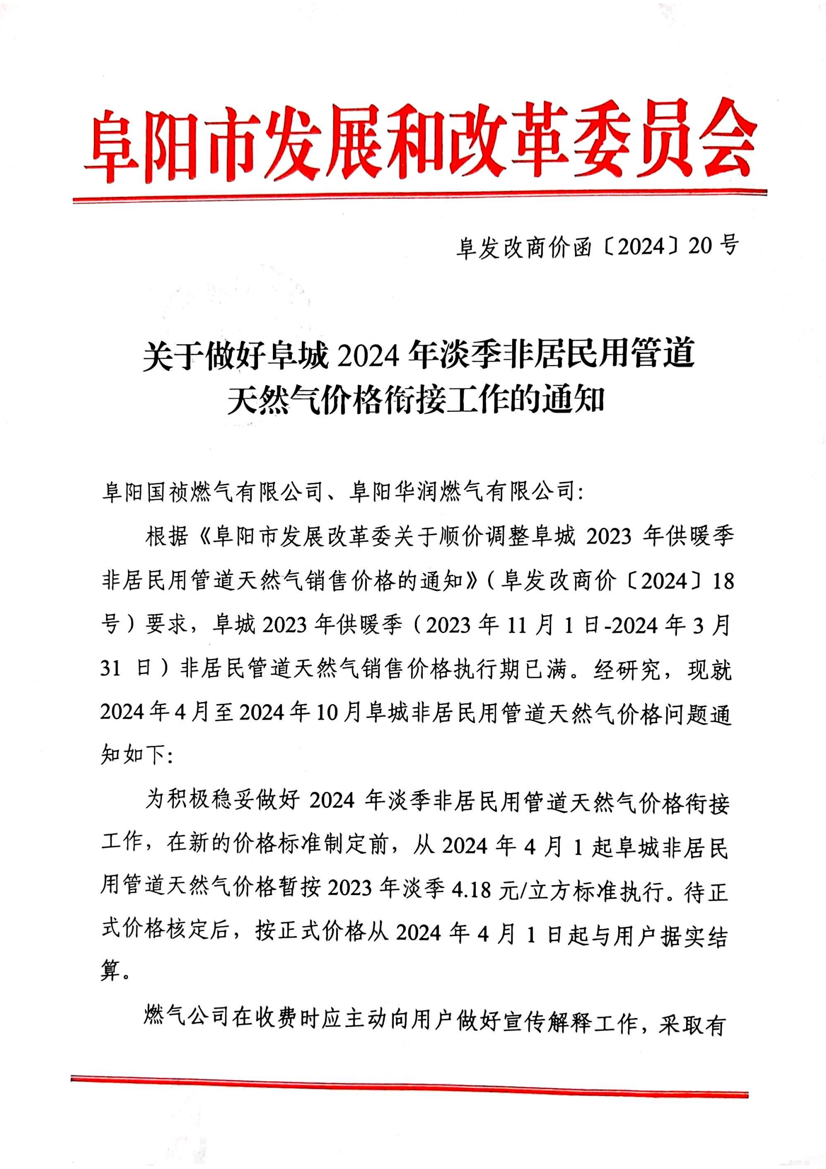 关于转发阜阳市发改委《关于做好阜城2024年淡季非居民用管道天然气价格衔接工作的通知》